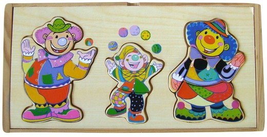 "Набор с одеждой 3 клоуна" представляет собой деревянный сундучок, внутри которого находится "гардероб", а на крышке углубление в форме клоунов, куда можно вставлять детали паззла. Каждая фигурка клоуна составляется и трех частей: головы, туловища и ноги.