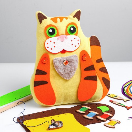 Игра «Ай, болит!». Расскажите ребенку, что кот Кузя заболел. Отстегните все детали (на пуговицах и липучках), разложите их на столе. Предложите ребенку «вылечить» Кузю: погладить хвост, «помазать» лапы, глаза, щеки лекарством, пристегнуть все детали обратно, «вдеть» коту усы.