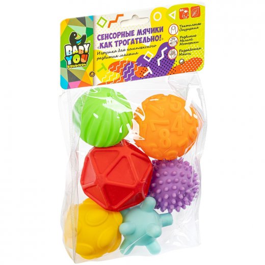 Рельефные поверхности мячиков способствуют развитию мелкой моторики и тактильных ощущений малыша. Яркие цвета стимулируют развитие зрения крохи.