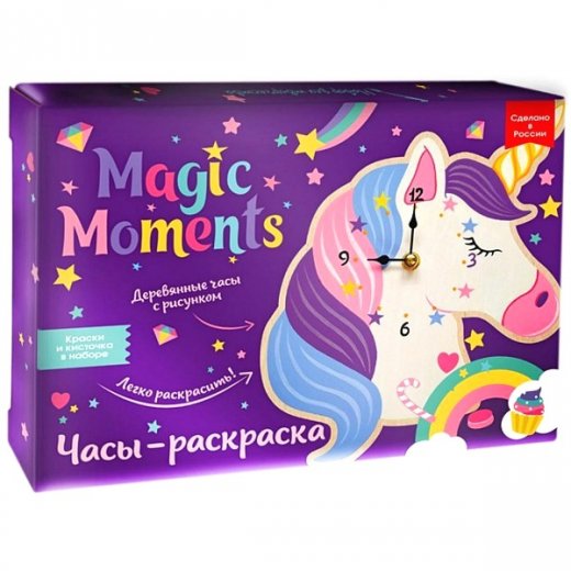 Часы-раскраска с циферблатом в форме единорога - замечательный подарок для всех, кто верит в чудеса! Такой оригинальный сувенир можно сделать своими руками. Внутри красивой коробки: деревянная заготовка, часовой механизм, краски и кисточка. Придумайте дизайн для вашего авторского сувенира или воспользуйтесь схемой раскрашивания, которая размещена на коробке.