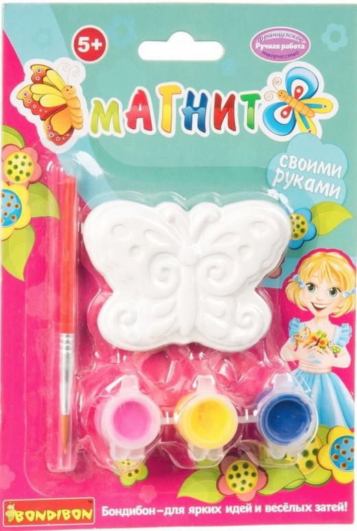 Набор для творчества "Бабочка" из серии "Магнит своими руками" предлагает девочке самостоятельно сделать оригинальный сувенир для украшения комнаты. Комплект включает в себя керамическую фигурку бабочки и несколько красок, с помощью которых девочка сможет раскрасить крылья бабочки в яркие цвета в любой комбинации, по своему вкусу. В комплект также входит магнитик, благодаря которому этой фигуркой можно будет украсить дверцу холодильника или шкаф, а можно будет подарить кому-нибудь. Такое занятие непременно понравится девочке, а творческий процесс будет способствовать развитию фантазии, воображению, мелкой моторике рук и творческому мышлению.