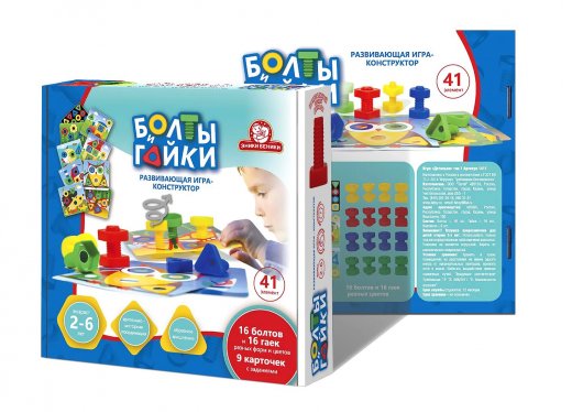 Состав набора: 16 болтов и 16 гаек 4 разных цветов и форм (квадрат, треугольник, круг, шестиугольник), 9 двухсторонних красочных карточек, красочная упаковка с инструкцией.