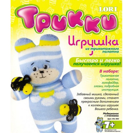 В набор для творчества входит все необходимое, чтобы сшить самостоятельно полноценную симпатичную игрушку из трикотажа. В коробочке ребенок сможет найти: подробную инструкцию, ткань для медвежонка и пчелок, мягкий пушистый наполнитель и декоративные элементы. Соединив все эти детали, можно пополнить свою коллекцию игрушек забавным персонажем из бело-голубой ткани, украшенного желто-черными пчелками.