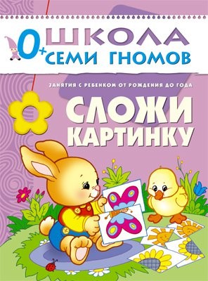 В этой книге достаточно сложные задания. Поэтому для начала можно просто рассматривать иллюстрации в книге. А ближе к году разрезать каждую картинку на 2 части и учить малыша составлять из них целое. Складывать надо грибок, бабочку, божью коровку, цветочек, рыбку, кораблик и др. В ходе такой игры развивается восприятие и логическое мышление малыша.