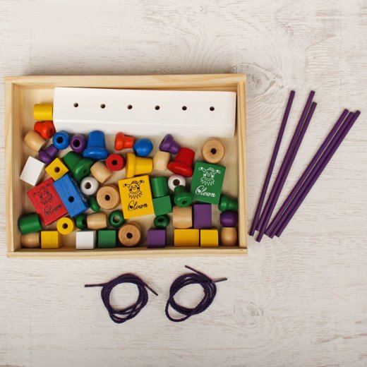 "Набор бусин на спице" предлагает сразу 2 развивающие игры. Составляйте пирамидки из геометрических бусин на спицах и собирайте фигурки пестрых клоунов на шнурках!