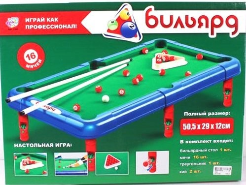 Состав: бильярдный стол, треугольник, кий (2шт), мячи (16шт).