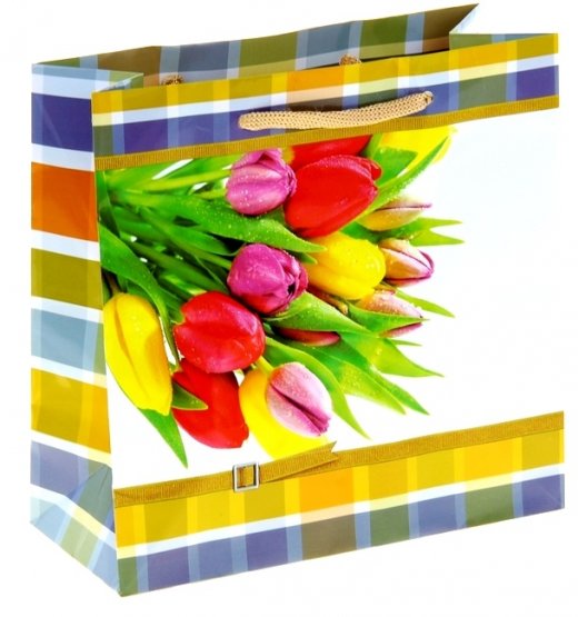 Ламинированные бумажные пакеты — лидеры по популярности среди подарочной упаковки. Выполнен он в ярких и красочных тонах, с изображением яркого и сочного букета тюльпанов. Такой пакет несомненно понравится прекрасной половине человечества. Благодаря качественной печати рисунок не сотрётся и не выгорит и к тому же он достаточно прочен, способен выдержать до 10 килограмм. Так что в дальнейшем его владелец может пользоваться им по прямому назначению, для походов в магазин и т.д.
