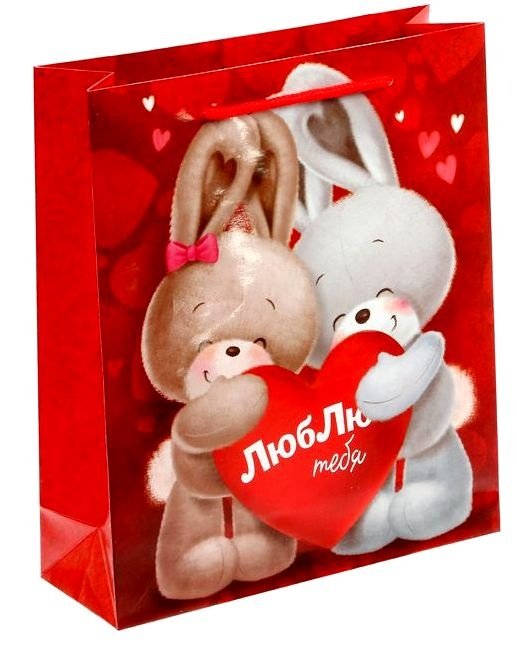 Пакет подарочный Влюбленные зайки - можно использовать как небольшой презент или как красивую упаковку под непосредственный подарок. Любой подарок начинается с упаковки. Что может быть трогательнее и волшебнее, чем ритуал разворачивания полученного презента. И именно оригинальная, со вкусом выбранная упаковка выделит ваш подарок из массы других. Она продемонстрирует самые тёплые чувства к виновнику торжества и создаст сказочную атмосферу праздника. Ламинированные бумажные пакеты — лидеры по популярности среди подарочной упаковки. Выполнен он в ярких и красочных тонах, с изображением милых влюбленных заек, которые несомненно понравятся прекрасной половине человечества. Благодаря качественной печати рисунок не сотрётся и не выгорит и к тому же он достаточно прочен, способен выдержать до 10 килограмм. Так что в дальнейшем его владелец может пользоваться им по прямому назначению, для походов в магазин и т.д.