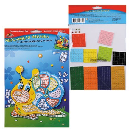 В наборе детская мозаика есть самоклеющиеся детали для создания картинки. Всего есть 12 видов картинок, которые получаются в результате творчества. Рекомендуемый возраст: от 4-х лет.