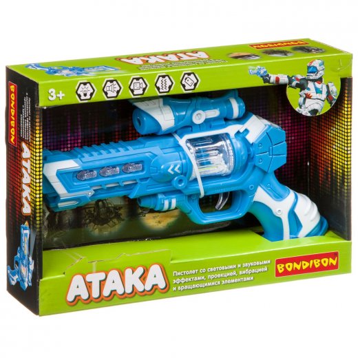 С этим пистолетом ребёнок сможет представить себя настоящим героем и придумать много сюжетов с импровизированными сражениями. Пистолет обладает световыми и звуковыми эффектами, проекцией, вибрацией и крутящимися элементами.