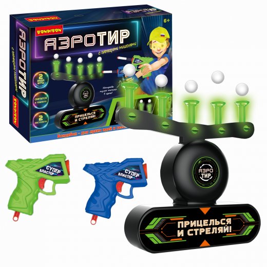 «АЭРОТИР» - популярная и захватывающая игра. Дети всех возрастов с удовольствием посоревнуются в умении метко стрелять по мишеням. Имеется два режима игры: стрельба по вращающимся шарикам-мишеням и стрельба по мишеням, на которых указано количество набранных баллов. Для начала установите на основании вашего тира подставки для мишеней. Если вы будете стрелять по неподвижным мишеням и набирать баллы, просто установите их на подставки. Если вы решили стрелять по вращающимся шарикам-мишеням, то поместите пять шариков на подставки, включите кнопку вкл/выкл на основании тира, отрегулируйте нужную вам высоту полёта шариков и стреляйте по парящим в воздухе целям. Придумывайте и устанавливайте свои правила игры.