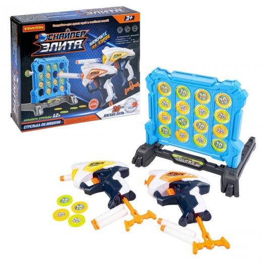 Приготовьтесь к атаке с игровым набором СНАЙПЕР ЭЛИТА от Bondibon! Стреляйте по мишени мягкими пулями одновременно из 2 бластеров с двух рук! Соревнуйтесь с другом в скорости и меткости!