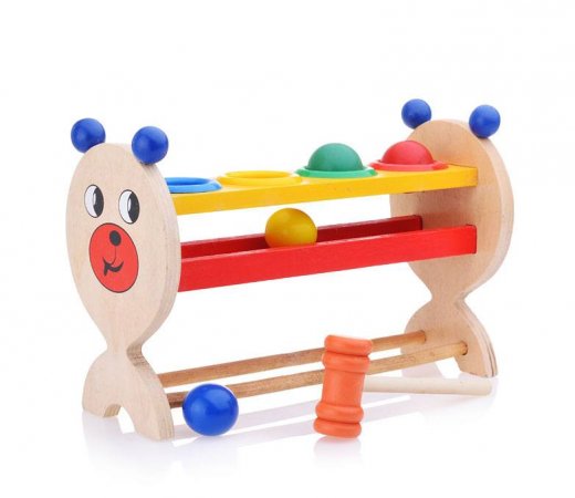 Стучалка "Шарики" состоит из прочно закрепленной дощечки, шариков разных цветов и молоточка. Суть игры заключается в следующем: необходимо вставить в отверстие шарик того же самого цвета и ударить по нему деревянным молоточком! Шарик проваливается в дырку и начинает свой путь по горке: с грохотом он падает на наклонную доску, катится по ней, потом через специальное отверстие попадает на деревянные "рельсы" и катится уже по ним в самый низ игрушки.