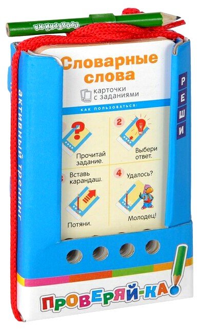 Игра с карандашом Проверяйка Словарные слова –– это весьма занимательное и очень даже полезное занятие для ребенка. Комплект состоит из 48 двухсторонних карточек и рассчитан на две разных игры с цветной и чёрно-белой сторонами. В заданиях на цветной стороне нужно выбрать правильный ответ из 4-х предложенных. Нужно найти, в каком слове пишется определенная буква, в каком слове пропущены одинаковые буквы. Для этих заданий предусмотрен оригинальный механизм самопроверки. Во время выполнения заданий карточки вставлены в блок, внизу которого расположено 4 отверстия. Выбрав вариант ответа, нужно вставить карандаш (прикреплен к блоку) в соответствующее ответу отверстие. Затем нужно потянуть за карточку, если ответ выбран правильно, карточка вынется из блока, если неверно - нет.