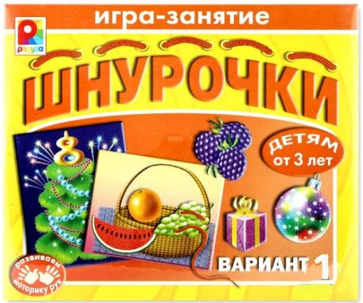Игра - занятие Шнурочки Вариант 1 – это весьма интересный и занимательный подарок для занятий и развития ребенка. Научиться завязывать шнурки самостоятельно совсем не легко! Обучающий набор включает карты с яркими рисунками, к которым малышам предлагается привязать шнурками отдельные детали. Просто и очень интересно! В наборе две большие карточки (новогодняя елка и корзинка для фруктов), 4 шнурка и детали для создания объемных картинок – елочные игрушки и аппетитные фрукты. Перед началом игры закрепите шнурок в любом отверстии картинки, сделав с изнаночной стороны узелок.
