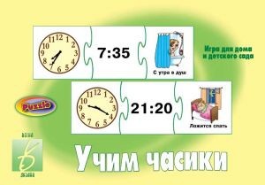Развивающая игра Учим часики – это весьма интересная и занимательная игра для детей старшего дошкольного возраста, при помощи которой малыши научатся определять время по часам, познакомятся с режимом дня, часами суток (утро, день, вечер, ночь), научатся соотносить время с определенным действием персонажа. В составе игры 20 карточек, каждая из которых представляет собой большой пазл из трех частей. На левой и центральной части каждой карточки изображено время происходящего события: сначала на механических часах, затем цифрами, как на электронных. Само событие изображено на правой карточке (это примерные занятия ребенка в то или иное время). Малыш рассыпает карточки, смешивает их, а затем самостоятельно или вместе со старшим, пытается собрать пазлы в необходимом порядке.