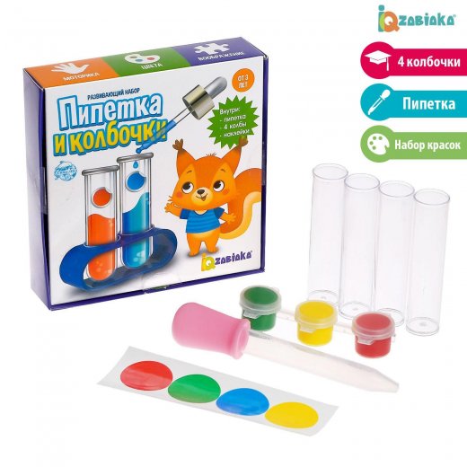 Развивающий набор Пипетка и колбочки предназначен для творческих и любознательных малышей. Ребёнок будет создавать яркие картинки с помощью пипетки, колбочек и красок. Набор поможет малышу развить моторику, мышление и логику.