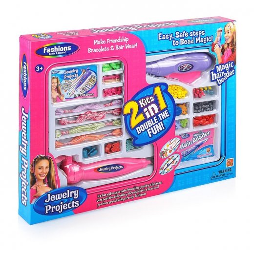 Состав набора: 2 прибора для плетения украшений, разноцветные бусины нитки, украшения для волос, подвески.