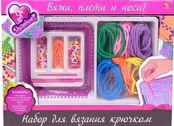 Благодаря разнообразной палитре цветов можно создавать уникальные вязаные вещицы своими руками, а еще украшать их бисером. Для этого в комплекте есть все необходимые элементы для вязания: 90 шнурков (6 цветов), 1 станок для плетения, 1 крючок, 1 пластиковая игла и бисер разных цветов и форм.