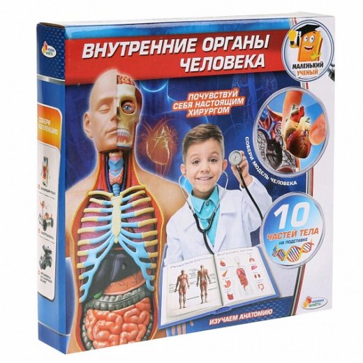 Анатомический набор Играем вместе «Маленький учёный: внутренние органы» позволит изучить и поближе познакомиться со строением тела человека. В него входит 10 различных органов человека: почки, мозг, лёгкие, сердце и другие. Из них можно собрать модель человека на подставке для изучения анатомии. Все органы надежно держатся на макете. Модель человека выглядит очень реалистично. При её создании соблюдены пропорции и особенности строения настоящего человеческого тела.